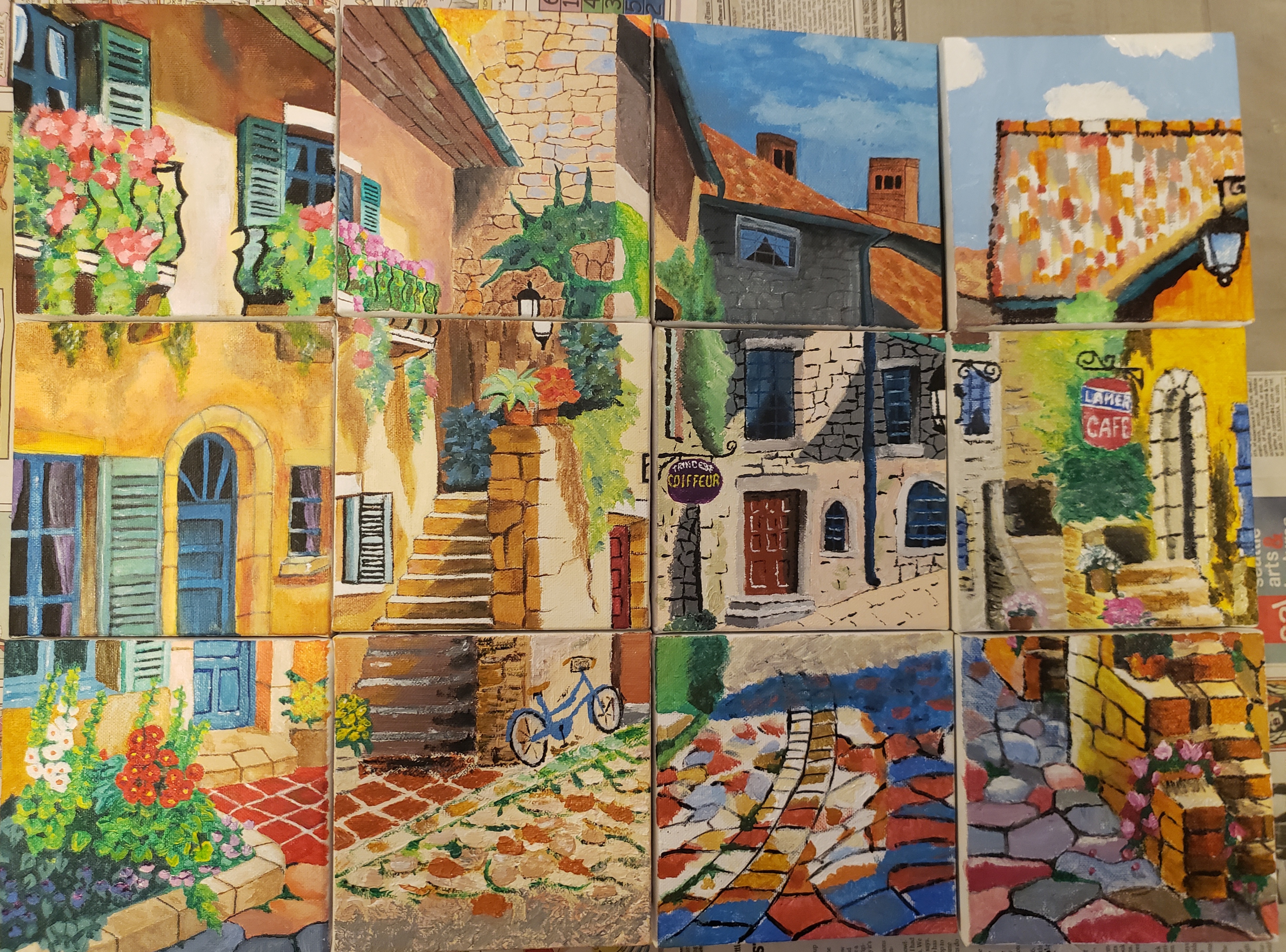 Look how cute it turned out! Obviously, the places where one painting ends and another begins don't exactly line up, but I think that adds to its overall charm. Plus it will be a great conversation starter when we are able to finally have guests over. Can you guess which ones I made...? Oh my gosh, you're right! How did you know?! Kidding. I made the second one in the top row, plus the one in the bottom left corner. Not too shabby, right?