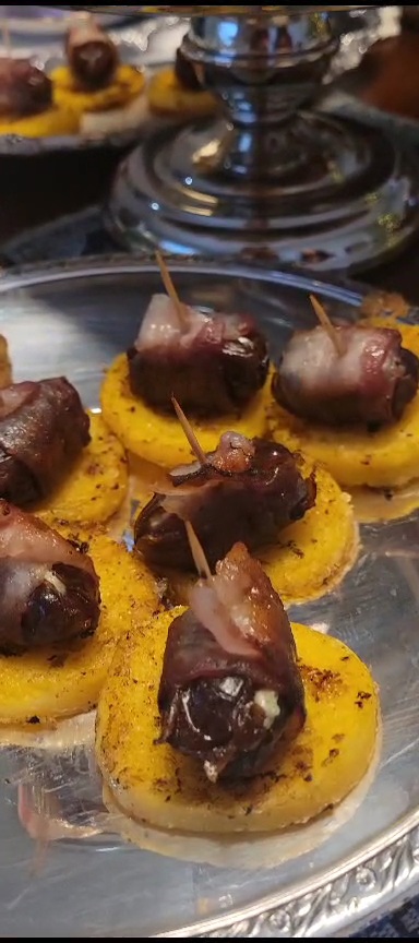 10:00 Make Bacon wrapped, gorgonzola stuffed dates & grill w/ polenta