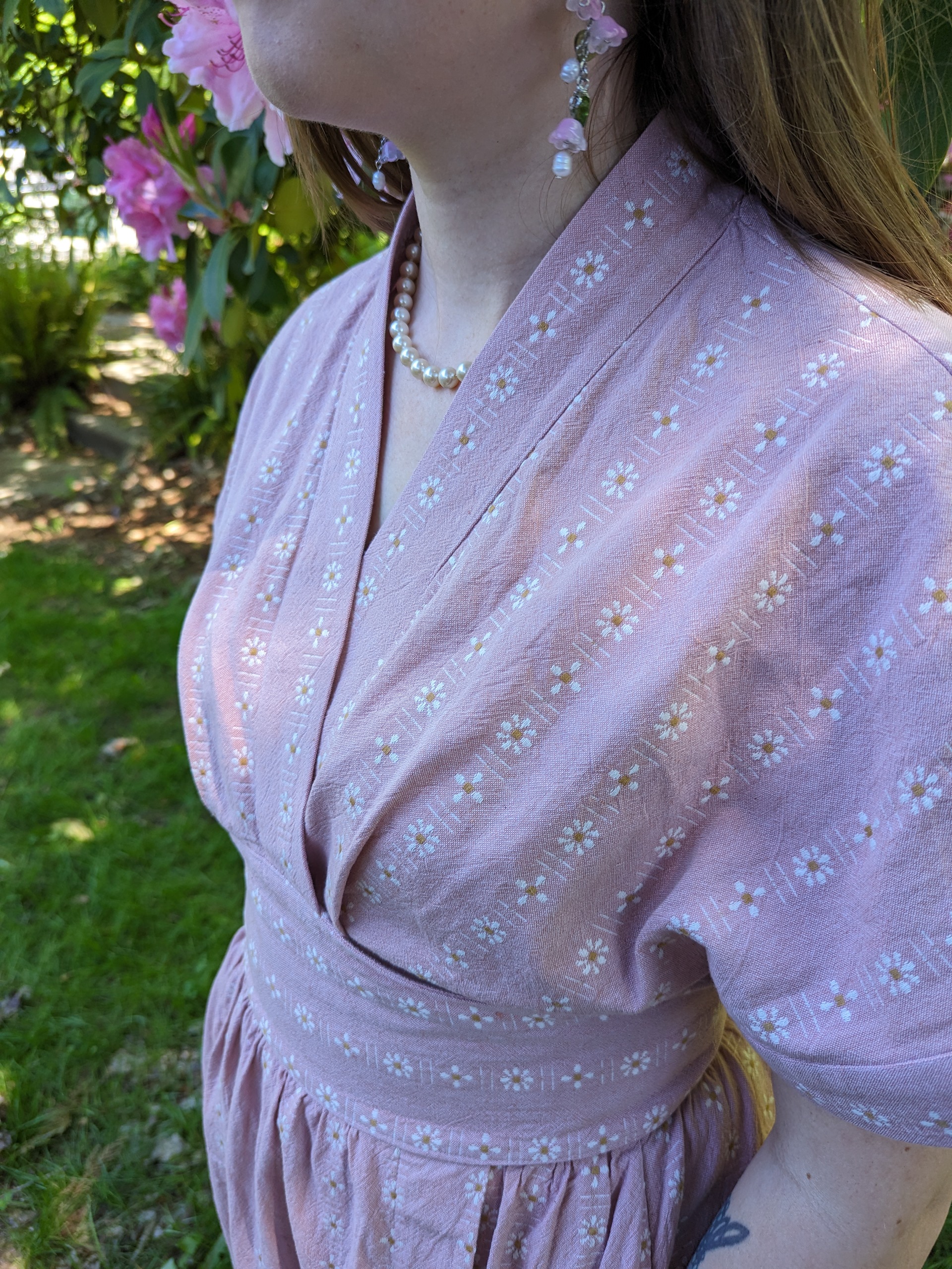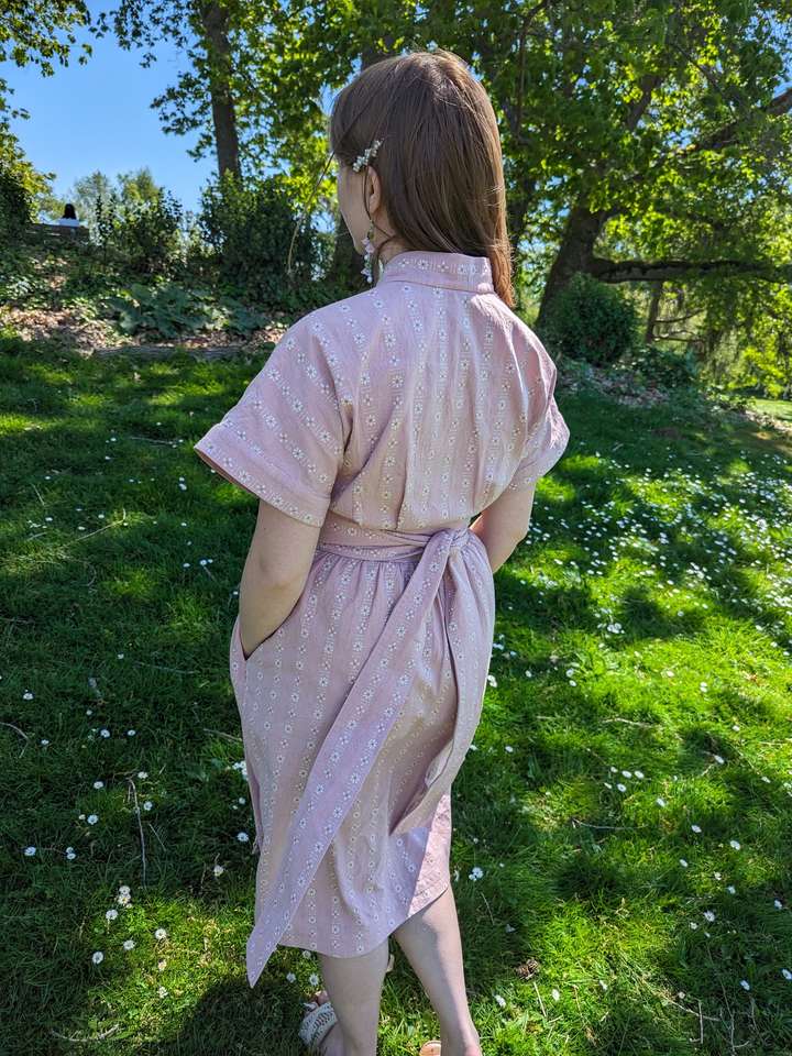 Thinking this mistake was irreparable, I bought a different fabric to make the dress—a pink cotton with woven daisy stripes. Aside from the printing mishap, this dress was pretty fun to put together! I really like that it was easy to choose different sizes for the bust, waist and hips. I chose a size 38 for my bust, and size 42 for my waist and hips. I was able to easily reduce the number of pleats for the bodice for it to fit the waistband. I chose the same size for the waistband and skirt pieces, but if you needed different sizes, it's as easy as changing the amount of gathering in the skirt.