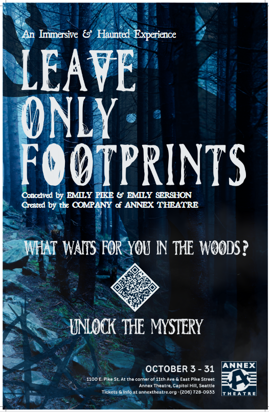 What waits for you in the woods? Leave Only Footprints is an immersive and haunted experience set in a cursed Pacific Northwest state park along the Salish Sea where a lone hiker has recently gone missing. Venture inside to explore the mysterious wood, encounter its inhuman inhabitants, and uncover the mystery of the wayward hiker’s disappearance. As you puzzle your way through the eldritch forest, remember to stay on the path or risk leaving only footprints.