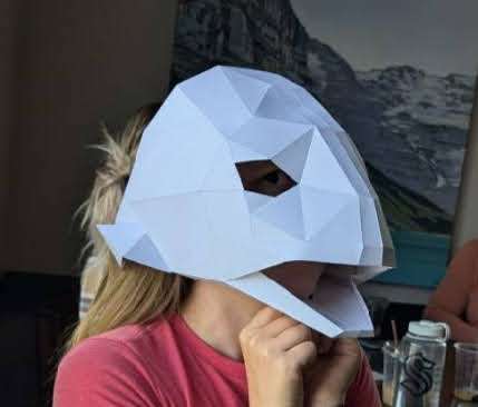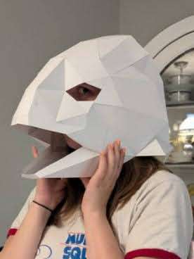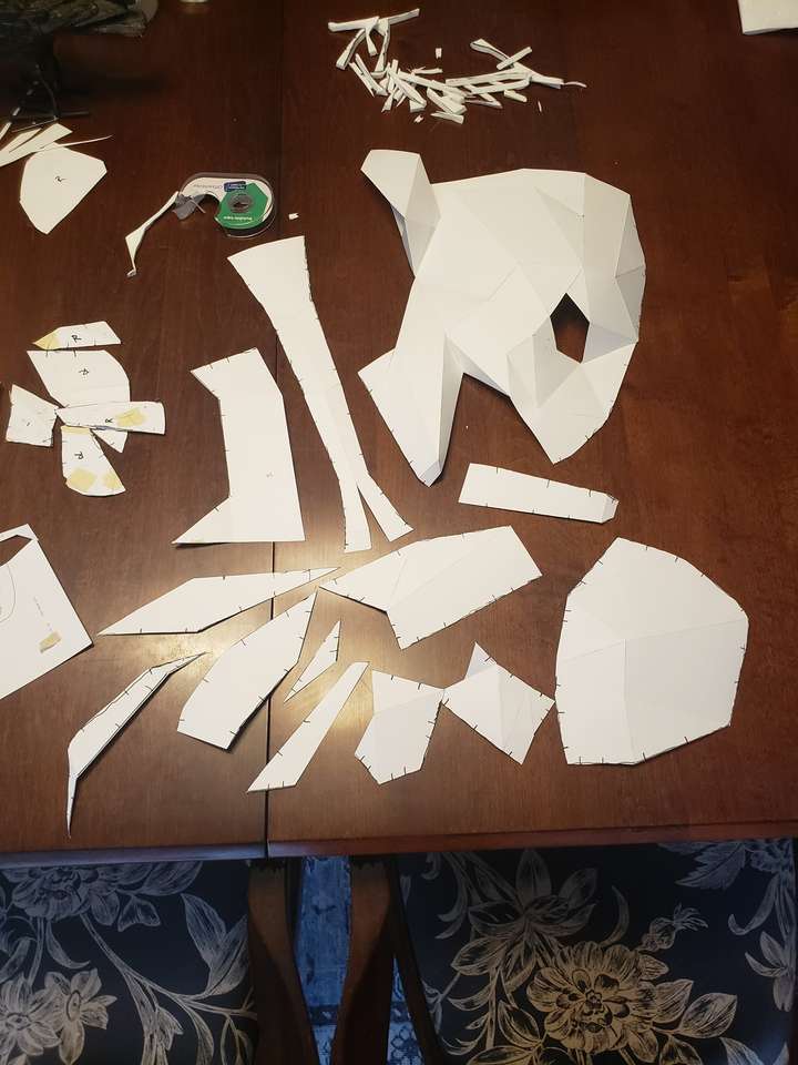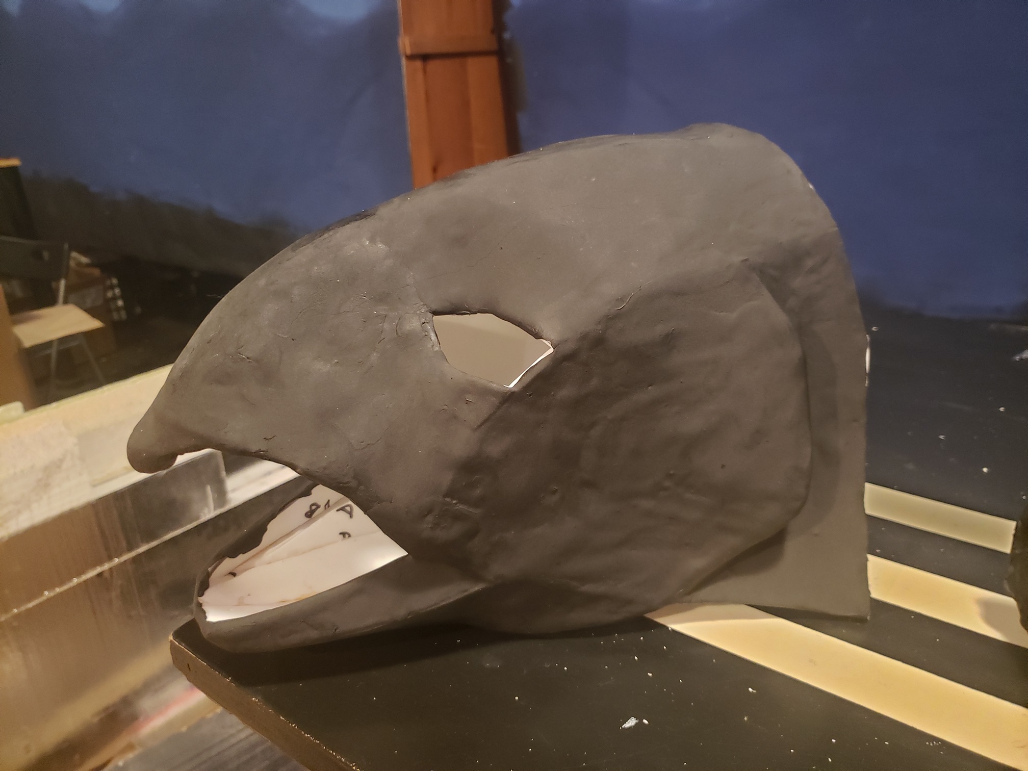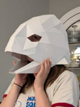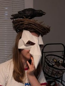 First, I gathered up my paper patterns; I got three off of etsy: the Raven, the Fish, and the Bat—and the last two were made by a friend with blender, and turned into a paper pattern using Pepakura. I printed them out on cardstock (100 lb weight), then folded and glued them. I used these paper versions to check the fit on the actors. The bat and fish masks had to be made more than once at different scales for a better fit.