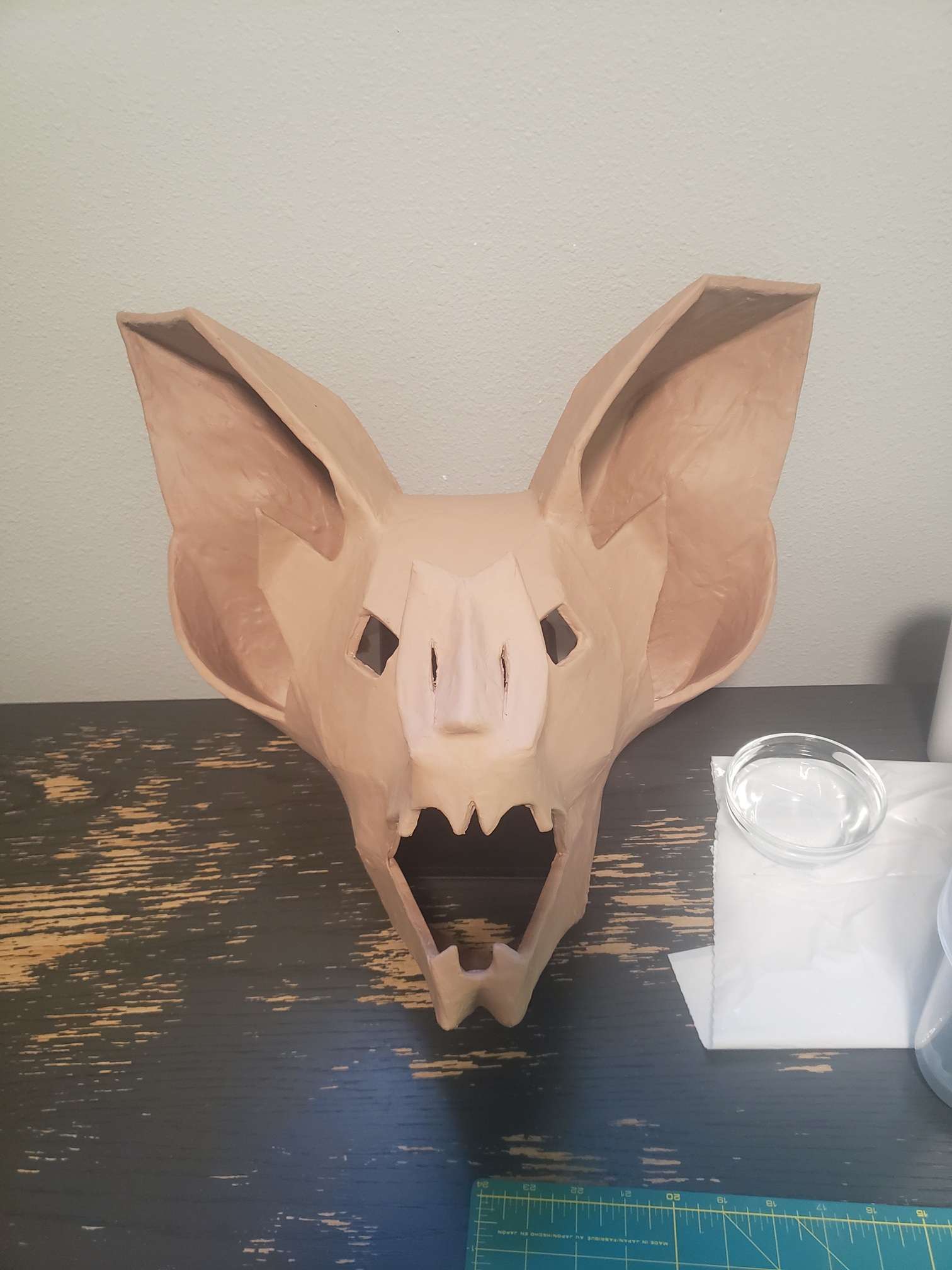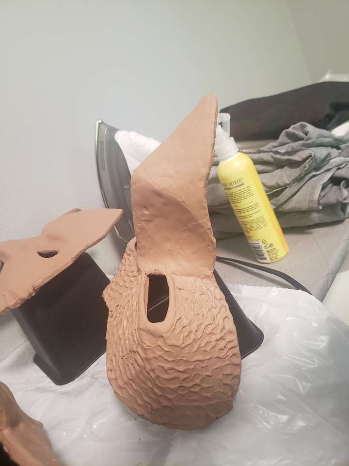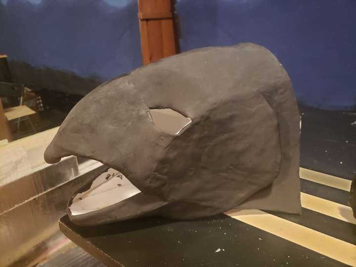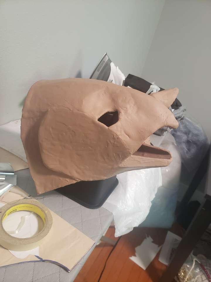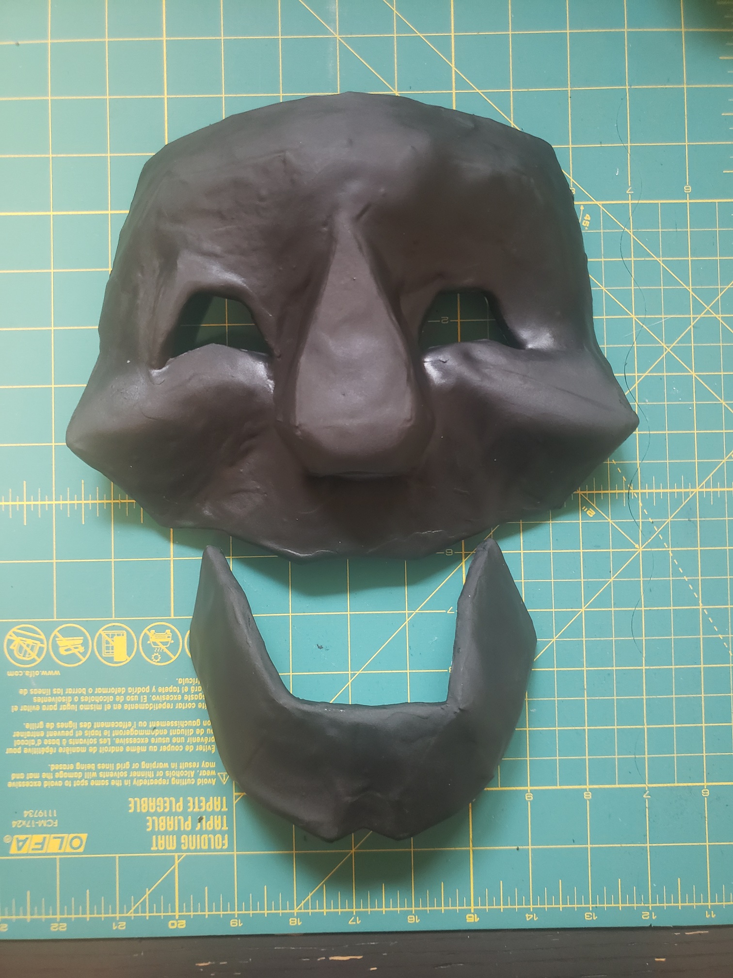 Once the foam clay had dried after 24 hours, I used a heat gun to 'seal' the foam. I'm not sure how necessary it was, but that's what the tutorial said to do, so that's what I did! The heat gun was also useful for re-shaping the things that warped as they dried. Instead of plastidip, like most websites suggest, I just primed the mask with three coats of mod-podge. This added some needed strength and a better surface to paint on top of. After that was dry, I did three coats of the lighter base color.