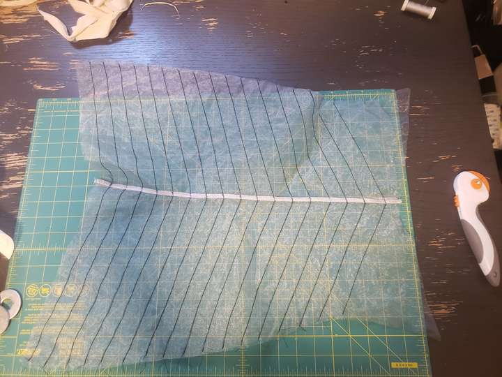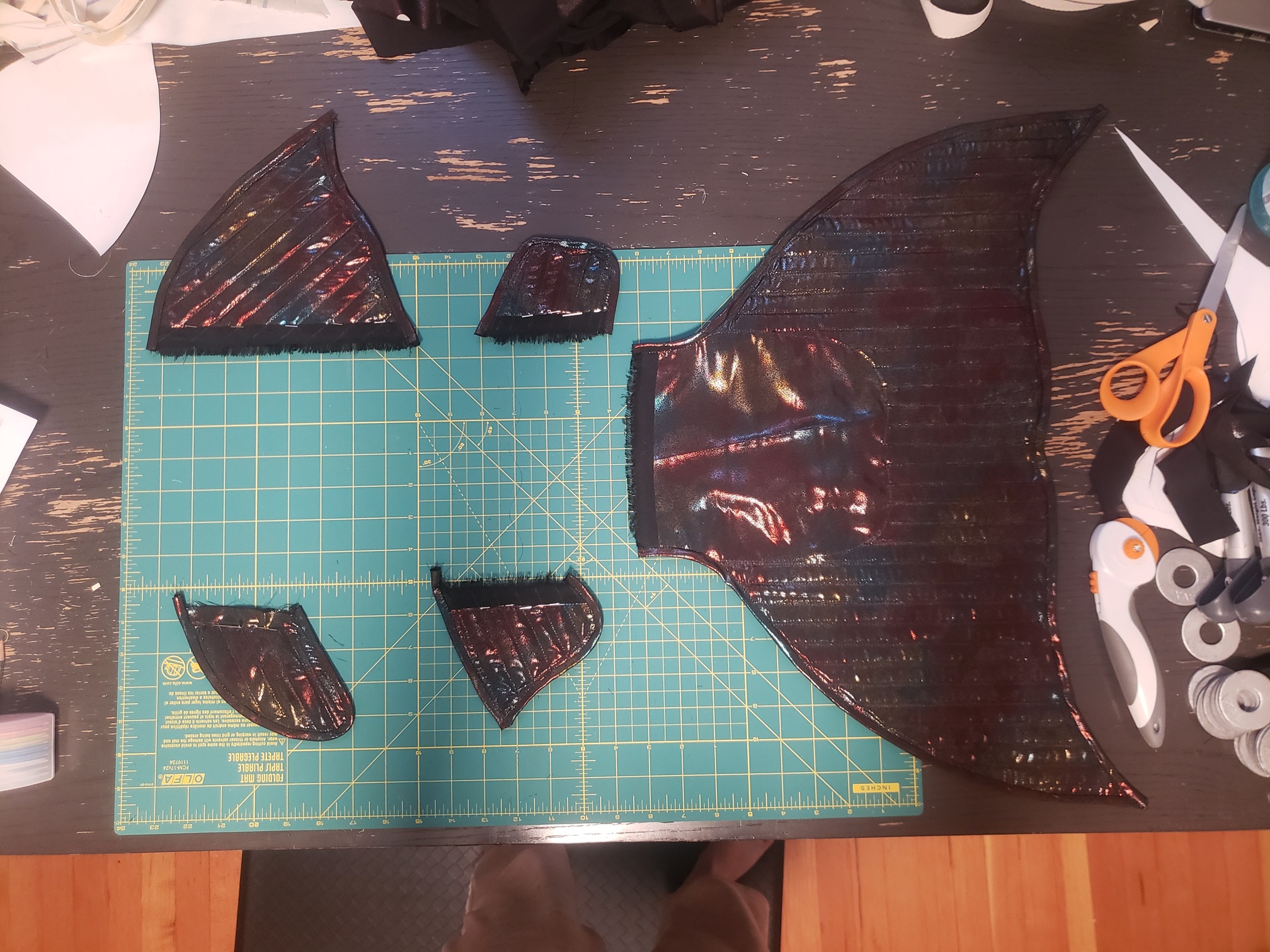 An iridescent black fabric was used for the fins—not exactly sure what kind, but the drape was similar to charmeuse, making it necessary to baste like crazy before adding all of the boning channels. The edges of the fins were all bound with double-fold bias tape that I made from the same material.