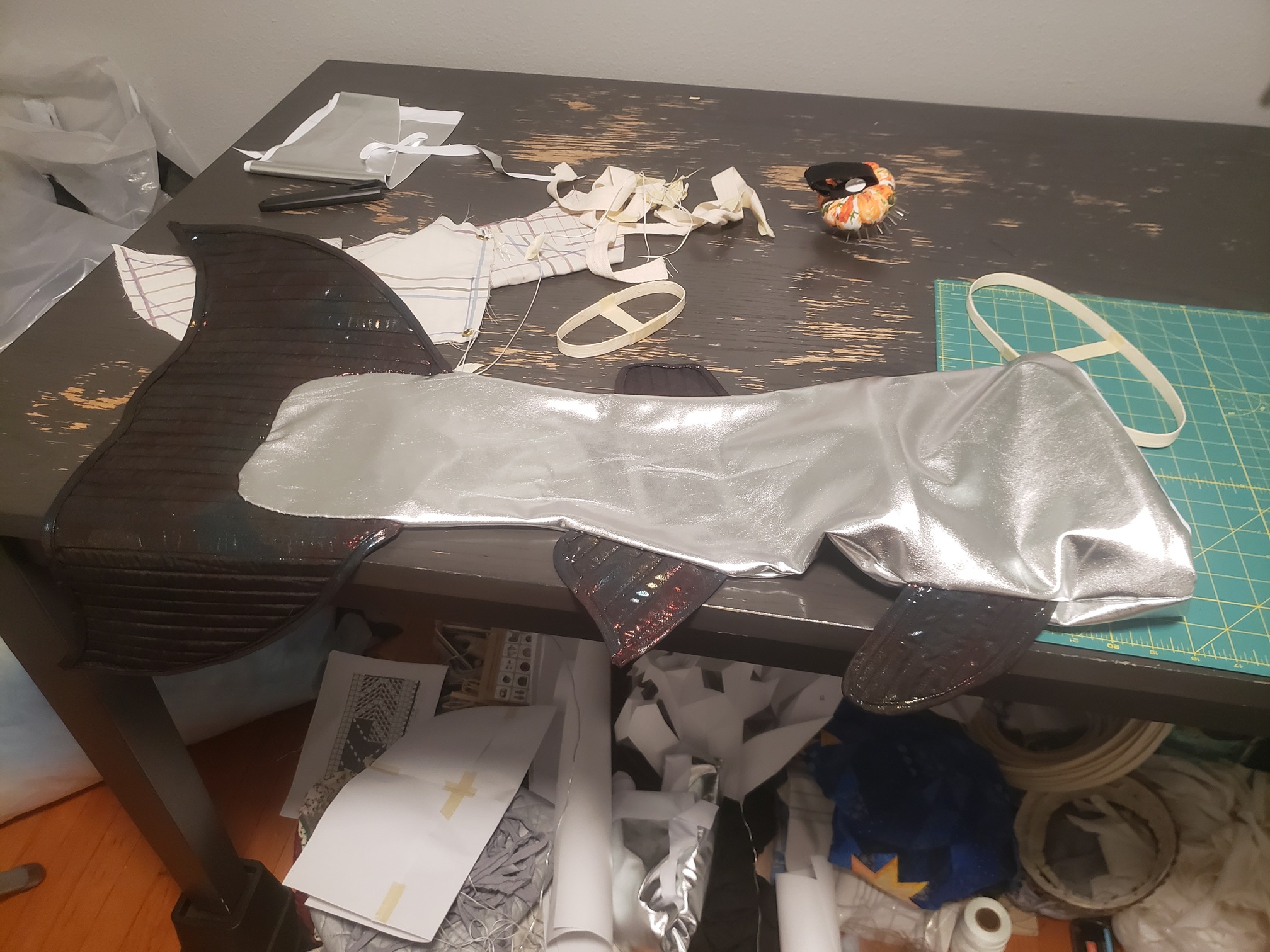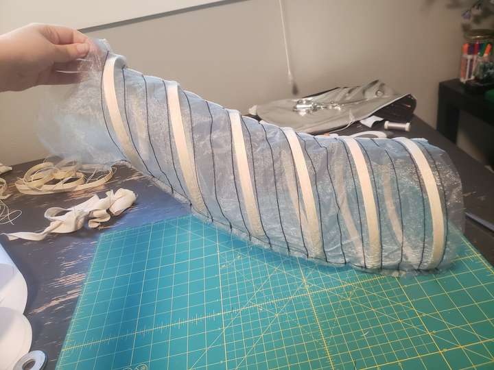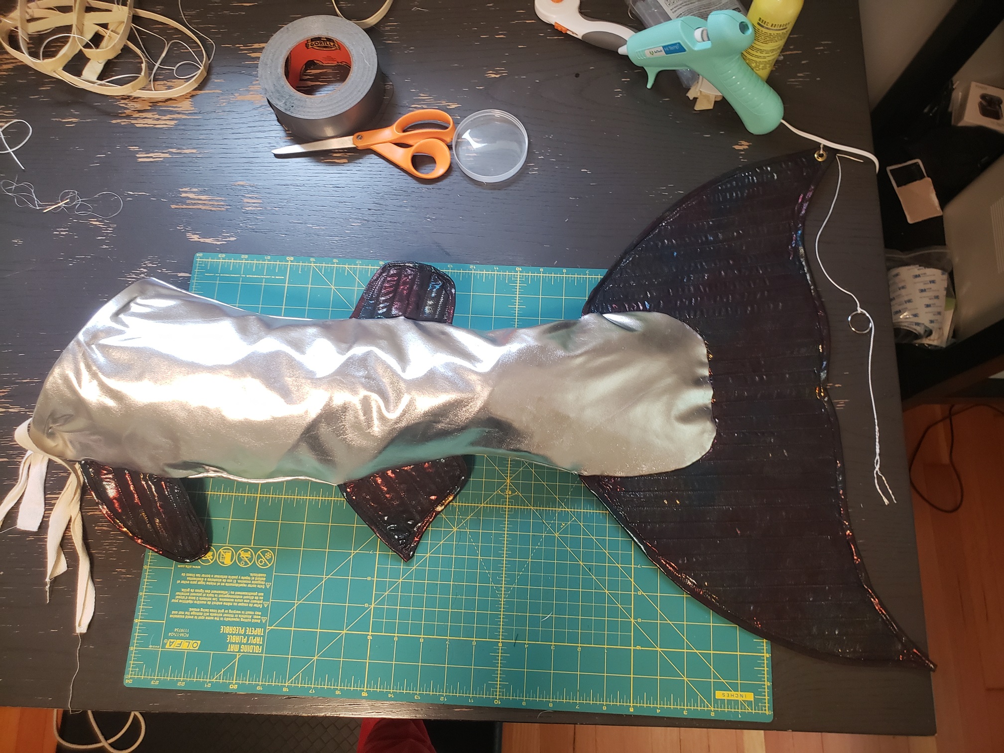 I used the tulle to give the tail more structure, and to hide the reed skeleton so that I wouldn't have boning channels visible on the outer tail. Funnily enough, the flattened version looks like a salmon filet! After adding the bones and sewing the two ends together, it was starting to literally take shape! I inserted it into the outer shell, pierced a skewer through the center to keep the top fin from flopping over, and lazily hot glued the raw edges inside. I eventually had to replace the reed boning with sturdier bodice boning because the reed boning broke after several weeks of shows.