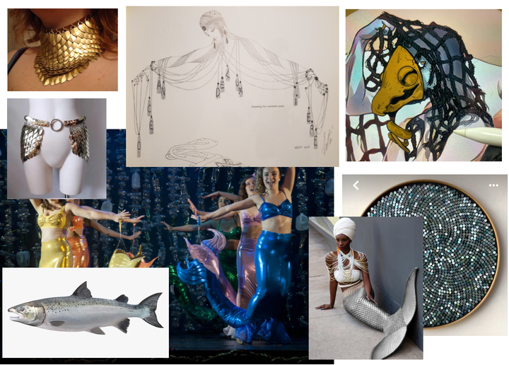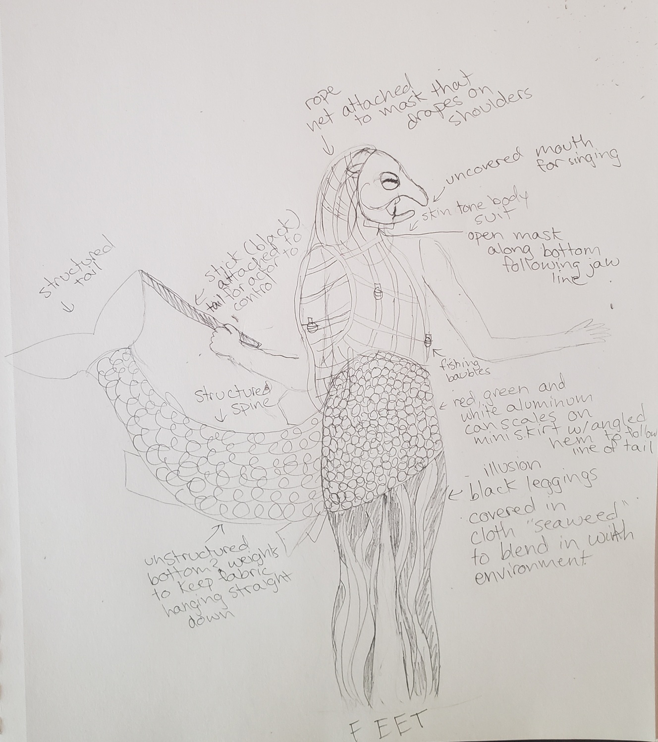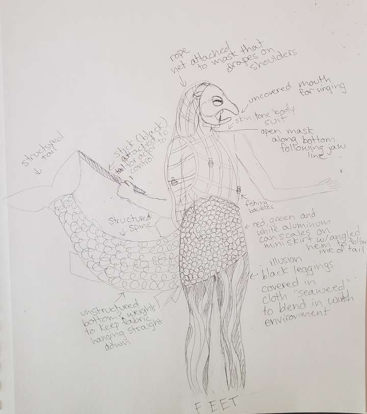 I think my ambitions for this costume were much greater than I managed to accomplish. In my initial concept, I had a lot of elements: scales made from aluminum cans, elegantly draped fishing nets, seaweed camoflauged leggings, etc.