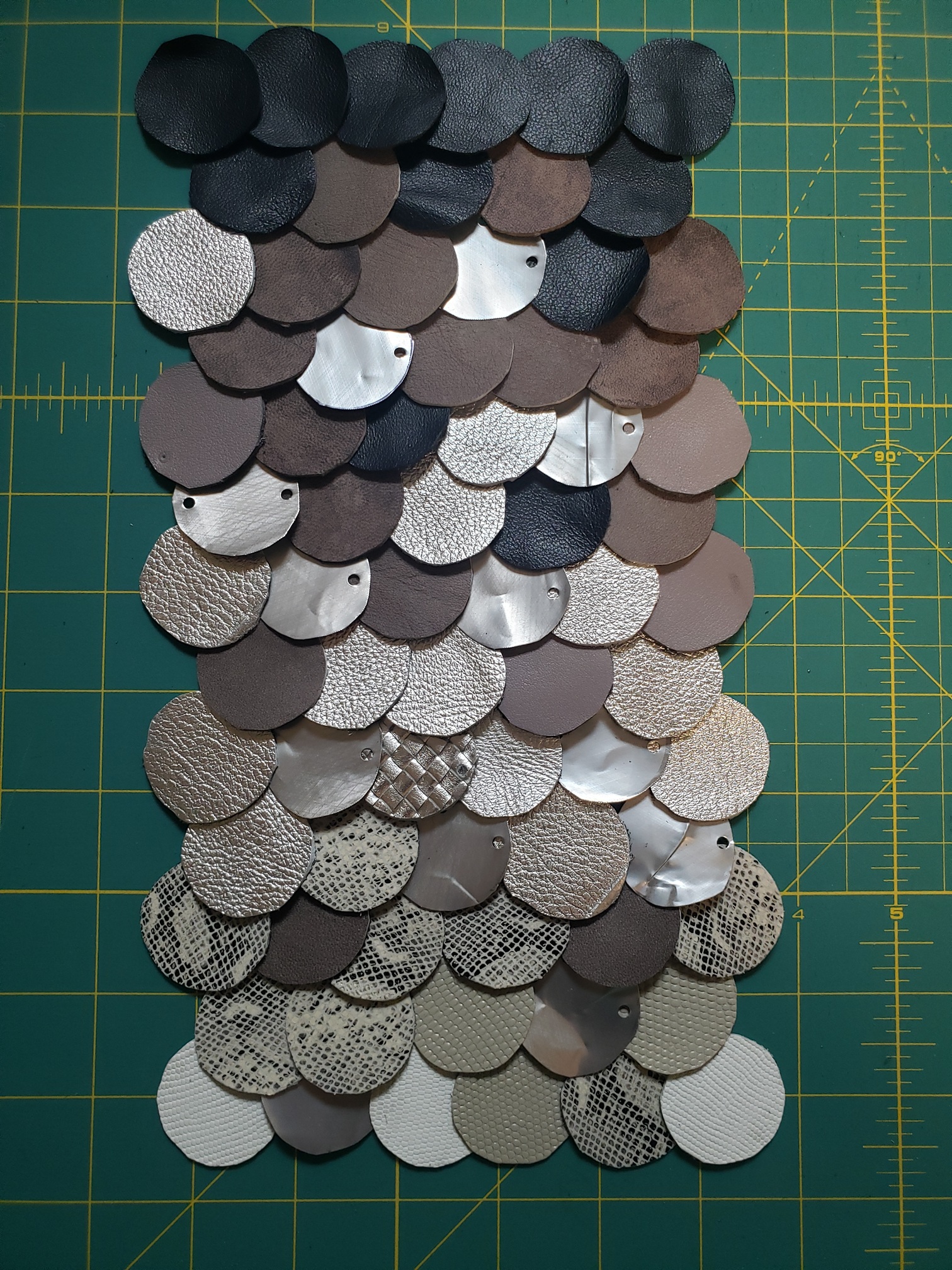 On instagram, I had remembered seeing these recycled art pieces where coin-sized aluminum can rounds were cut and strung up so that they glittered in the breeze. I set up a box in the theatre for people to bring me aluminum cans to use. I washed the cans, made a small template and cut hundreds of them. I think my original plan was to sew them onto the skirt itself...I don't know what possessed me to even consider that. I would have had to painstakingly tack them on by hand. I quickly realized this was impossible, but remembered the leather scraps I had in my closet. I'd been trying to figure out a use for them for awhile—a woman who used to run a purse-making business out of her home gave them up on buy-nothing last year and I took them off of her hands. Maybe I could cut rounds from those and then I'd be able to sew them more easily on my machine? But I gave up on that idea too because I don't think my machine would be happy with me if I tried to use it on leather. (You can see the test swatch I did below). That's when I pivoted yet again to the idea of creating scale-maille. However, the quality that made the aluminum perfect for those art pieces—being lightweight—made them difficult to use as scale-maille. I bought a pack of small rings and attempted to link them together, but they never layed quite right and were constantly shifting into wonky positions. Eventually, I scrapped the idea all-together, which was disappointing, but inevitable.